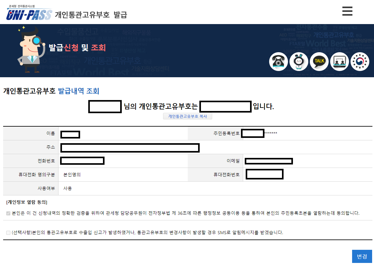 그리고 오른쪽 하단을 보시면 변경 버튼이 보이실텐데요 변경 버튼을 클릭하시면 개인통관고유부호 사용 정지를 할 수가 있고 재발급 등을 신청하실 수 있는 버튼이 보일 것입니다. 혹시나 개인통관고유부호를 사용하지 않을 분들은 발급을 받았더라도 정지를 하시면 됩니다.