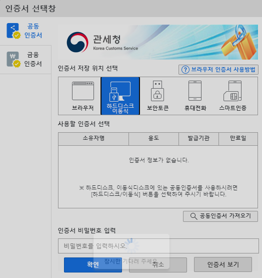저는 공동, 금융인증서를 클릭하여 본인인증을 하였습니다. 기본적으로 공동인증서가 선택되어있으며 금융인증서로 인증을 하시려는 분들은 왼쪽 사이드에서 금융인증서를 클릭하시면 됩니다.