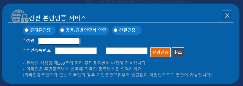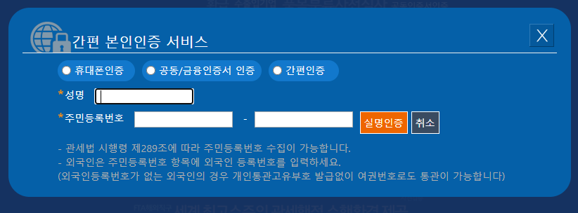 개인통관고유부호 조회를 하려면 본인인증을 먼저 하여야 합니다.