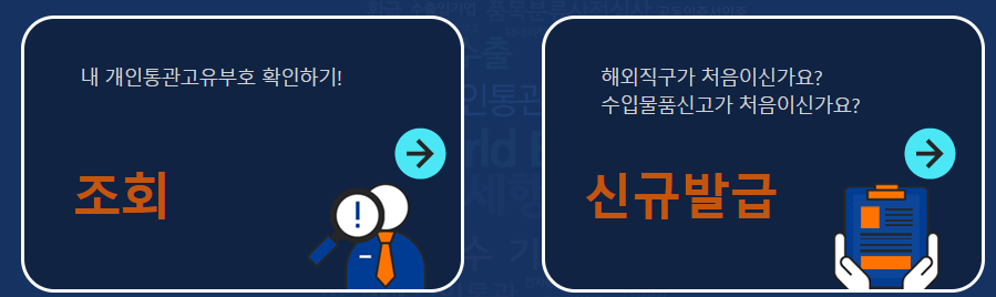 이때까지 살면서 개인통관고유부호를 발급받은 적이 없다면 신규발급 버튼을 클릭하셔야 하며 발급받은 적이 있으신 분들은 조회버튼을 클릭하시기 바랍니다.